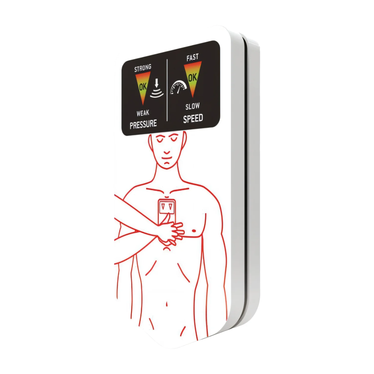 Dispozitivul include indicatori luminoși care ghidează salvatorul, arătând presiunea corectă și ritmul adecvat al compresiilor.