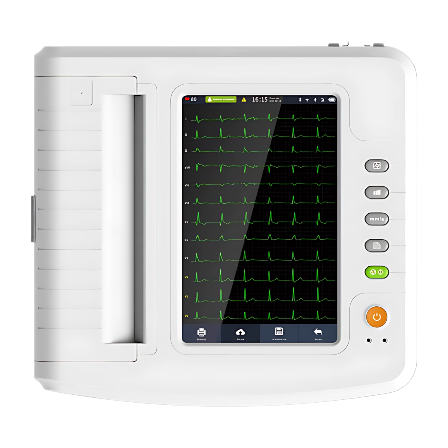 Electrocardiograful 1212G este prevăzut Ecran LCD color de înaltă rezoluție, 10,1” și rezoluție de 1280x800 pixeli. Poate colecta simultan semnal ECG cu 12 derivații și tipări traseul ECG prin sistemul termic de imprimare integrat.